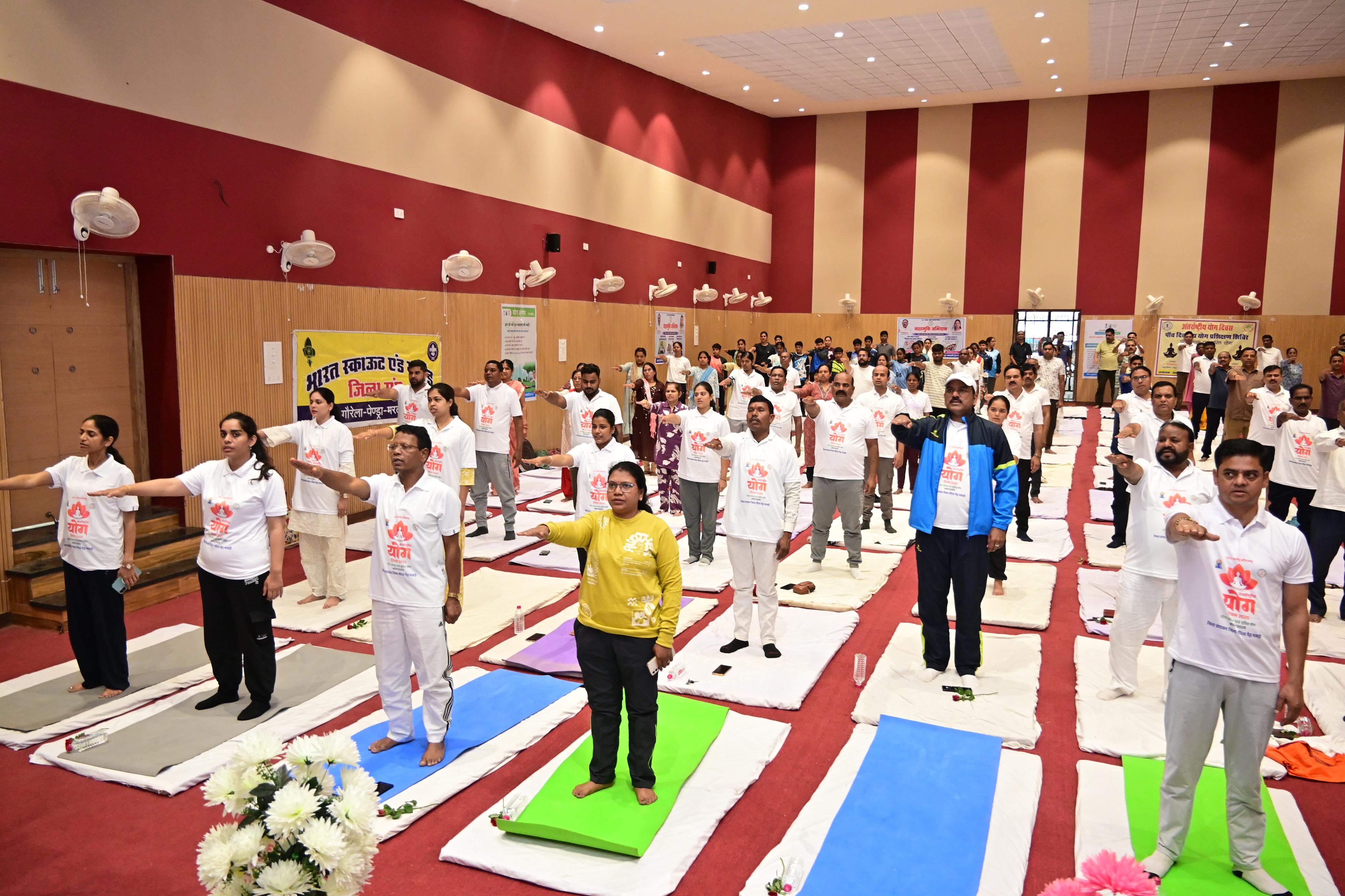 गौरेला पेंड्रा मरवाही, 21 जून 2025/ अंतर्राष्ट्रीय योग दिवस के अवसर पर आज असेम्बली हॉल मल्टीपरपज स्कूल पेण्ड्रा में मध्यक्षेत्र विकास प्राधिकरण के उपाध्यक्ष एवं मरवाही विधायक श्री प्रणव कुमार मरपची के मुख्य आतिथ्य में जिला स्तरीय योग कार्यक्रम आयोजित किया गया। योग प्रशिक्षकों ने विधायक, जिला पंचायत अध्यक्ष सुश्री समीरा पैकरा, उपाध्यक्ष राजा उपेन्द्र बहादुर सिंह, कलेक्टर श्रीमती लीना कमलेश मंडावी, पुलिस अधीक्षक श्री एस आर भगत, वनमण्डलाधिकारी श्रीमती ग्रीष्मी चांद सहित कार्यक्रम में उपस्थित अनेक जनप्रतिनिधियों, गणमान्य नागरिको, अधिकारियों-कर्मचारियों, विद्यार्थियों को सामूहिक रूप से विभिन्न योगासनों एवं मुद्राओं में योग कराया।